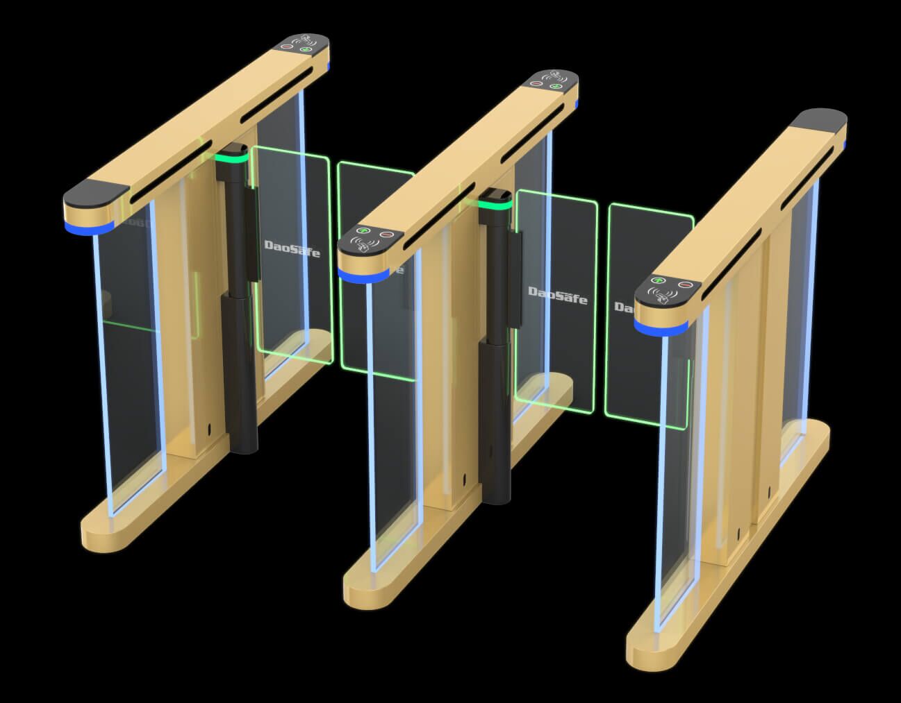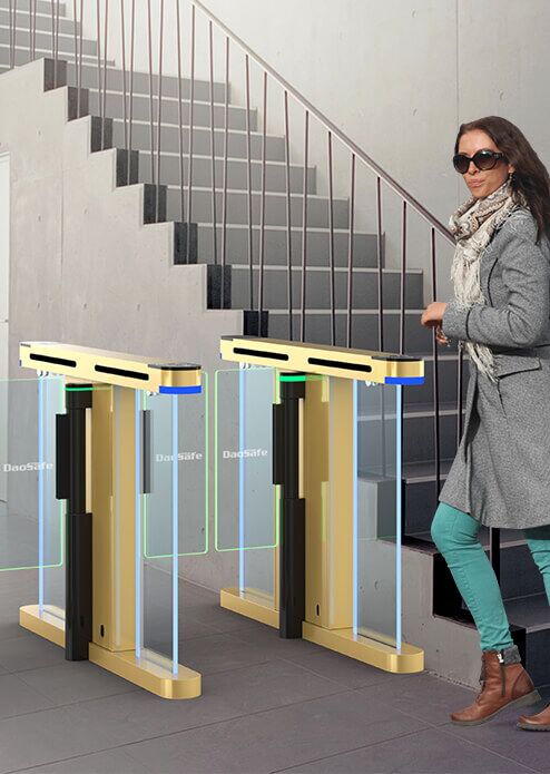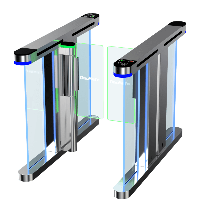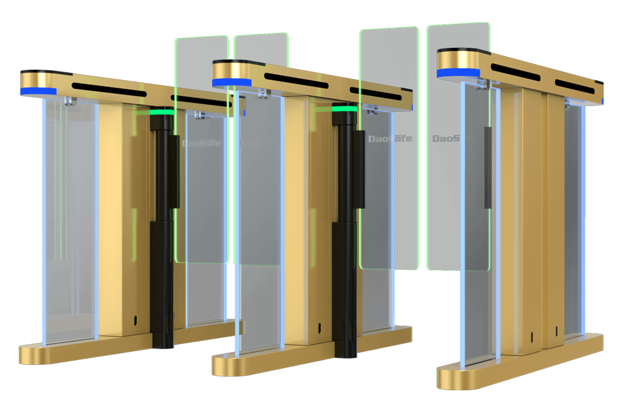 Glass side panels surrounded with dazzling decorative LED light bar make the whole gate compact and unique. The color varies for different entry/exit status.
